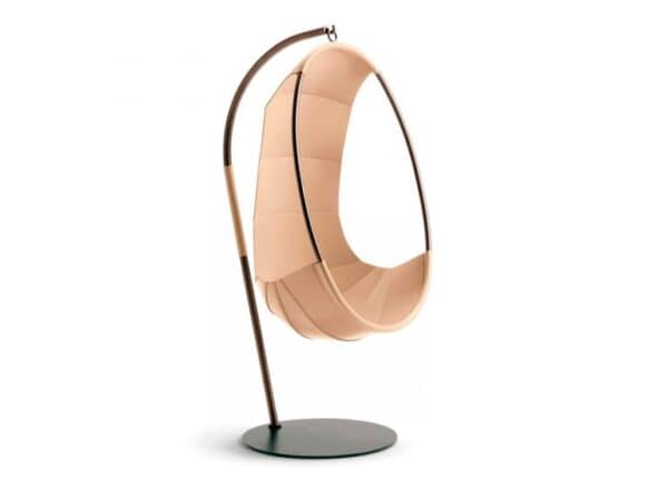 The Swing Chair by Ivano Redaelli stands out from other swing chairs for one simple fact; it can hang from the ceiling or stand on the floor. Its smart design incorporates a stand that holds and supports it without affecting its function. The chair has a metal frame which has been bent to form a very ergonomic and pleasing shape. A leather cover makes up the seat. It envelopes the metal framework and gives it a remarkable look.
