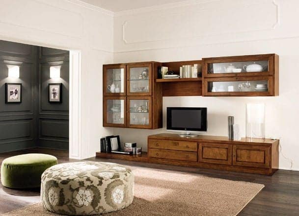In the living room, a low coffee table leaves plenty of room to admire the customizable entertainment center.