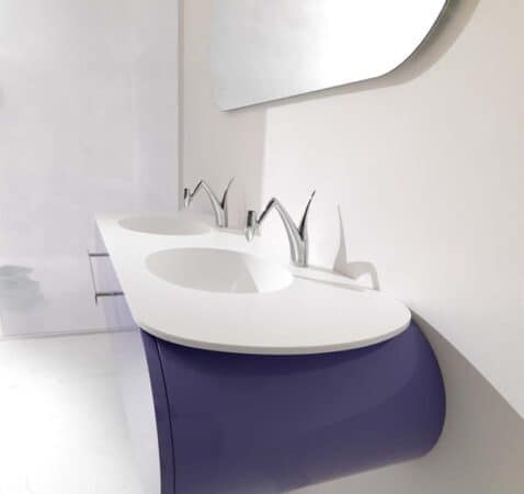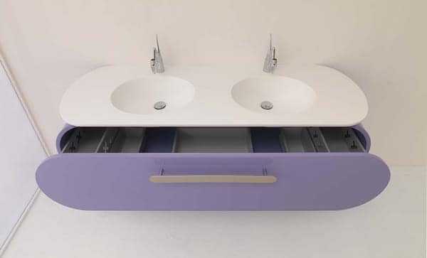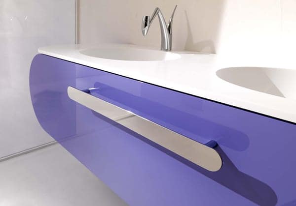 The Flux Us bathroom by Lasa Idea is based on an oval shape instead of a regular counter-height vanity. The mirror transforms from a standard rectangle into a smooth, oblong disc with subtle overhead lighting. The vanity itself echoes the shape of the mirror. Floating along the wall instead of supported by a base or legs, the Flux Us vanity opens up extra visual space in your bathroom, without sacrificing the convenience of double sink basins. A slim, round countertop with integrated sinks provides plenty of surface area and chic style.