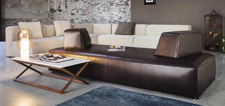 The whole range of differently sized and shaped ottomans helps to add symmetrical contrast to the room. The 275 Glam Sofa by Vibieffe is ideal for maximizing space while adding depth, personality, and texture to your living room.