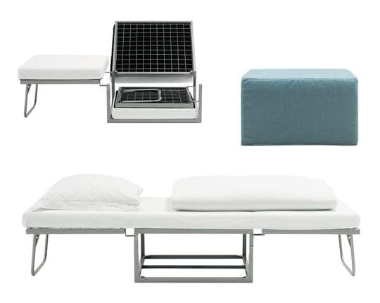 From BoConcept comes the perfect ottoman extra fold out bed combination that takes up a miserly 2 square feet and easily folds out to a full-length sleeping surface.