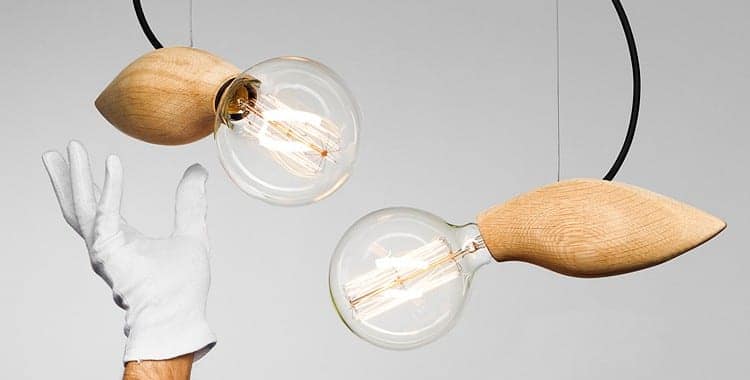 Special Bulbrite bulbs are connected to custom-made wood pieces to showcase superior Scandinavian design. When lit, the bulbs reveal patterns of tangled filaments.