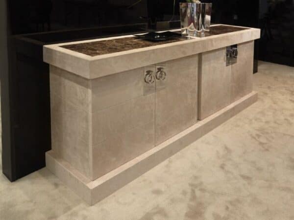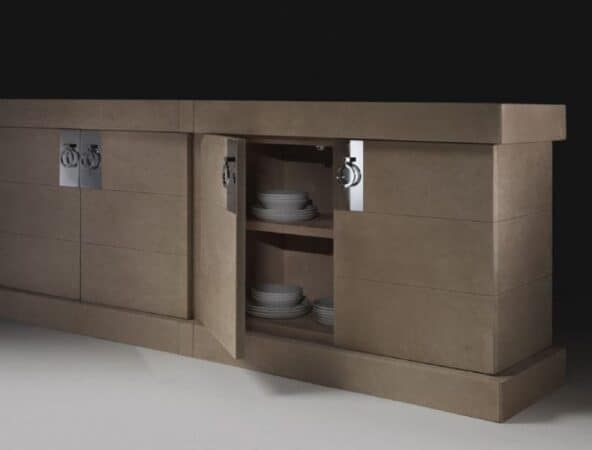 Its countertop adds a particular richness that is only exclusive to it while the leather makes a great statement on its specialness. The choice of highly polished ring pull doorknobs adds a subtle yet classy design element to the overall structure which deviates away from traditional sideboard knobs.