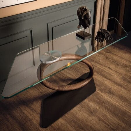 You’ll be forgiven for staring at it for hours as that’s what it has been designed to do, captivate and mesmerize. The table has a glass top, a circular leg, and a base in graphite embossed lacquered steel. Its leg is shaped like a ring and made from Canaletto walnut.