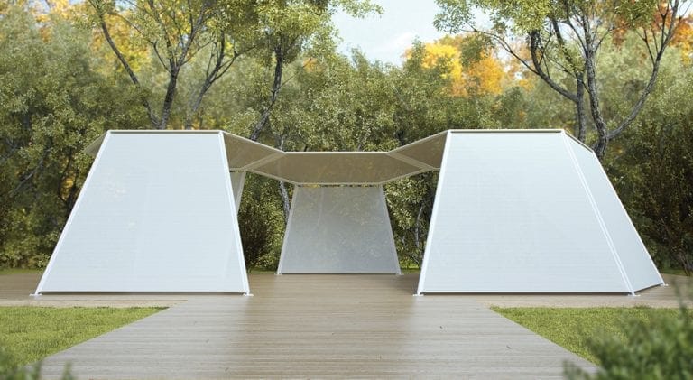 Broad and supportive side panels align perpendicularly at the rooftop to create an awning that shields against the elements. Covered in a complementing white polyester fabric, Pavilion not only offers refuge from the rain and wind; it also shields from UV rays.