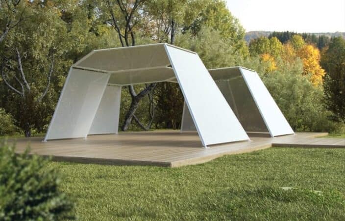 A great alternative to the polyester covering is Paola Lenti’s special fabric, Thuia, specifically designed for the outdoors. Using prompt-release Velcro bands, the cover is safely attached to the pavilion’s aluminum framework.