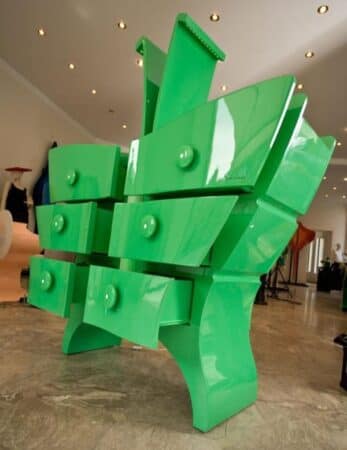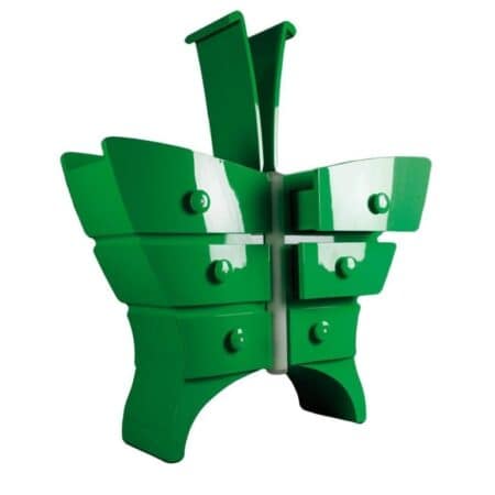 The chest stands upright on the tips of the “wings” and two antennae appear over the top the drawers when they are opened. The overall outline manages to achieve an interesting balance of elegant curves and cheerful playfulness, made all the more vibrant in a bright shade of spring green and a reflective, high-gloss lacquer finish.